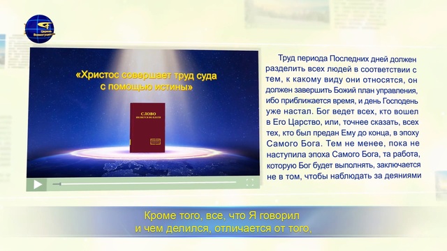 Слово Всемогущего Бога «Об именах и личности» Часть первая Всемогущий Бог говорит: «Иисус представлял Духа Божьего, и был Духом Божьим, Который работал лично. Он выполнил работу нового периода – ту работу, которую никто до этого не проделал. Он открыл новый путь, Он представлял Иегову, и Он представлял Самого Бога. Что же касается Петра, Павла и Давида, то, независимо от того, как их называли, они представляли лишь личность сотворенного Богом существа или были посланы Иисусом, либо Иеговой. Поэтому независимо от того, как много они трудились, независимо от того, насколько великими были творимые ими чудеса, они, тем не менее, были всего лишь сотворенными Божьими существами и не могли представлять Дух Божий. Они работали во имя Бога либо были посланы Богом. Более того, они работали в периодах, которые начинал либо Иисус, либо Иегова, и выполняемая ими работа не была самостоятельной. В конце концов, они были всего лишь сотворенными Божьими существами». Восточная Молния. Церковь Всемогущего Бога возникла в связи с трудом, совершаемым возвратившимся Господом Иисусом Христом эпохи Последних дней, Всемогущим Богом, в Китае. Данная церковь не учреждена никаким лицом. Христос – это истина, путь и жизнь. После прочтения Слова Божьего вы убедитесь в явлении Бога. Специальное заявление: это видео было создано на некоммерческой основе Церковью Всемогущего Бога. Это видео не может передаваться третьей стороне в целях извлечения выгоды, и мы надеемся, что все будут делиться этим видео и распространять его открыто. При распространении этого видео, пожалуйста, указывайте источник. Без согласия Церкви Всемогущего Бога никакая организация, общественная группа или лицо не может искажать или представлять в ложном свете содержание этого видео. Электронная почта : contact.ru@kingdomsalvation.org Свяжитесь с нами: ( Испания ) +34-603-342-565 ( США ) +1-917-238-3744 #ЦерковьВсемогущегоБог #ВосточнаяМолния #испытания #библия #крещение #библияонлайн #Молитва #судьбачеловека #жизнь