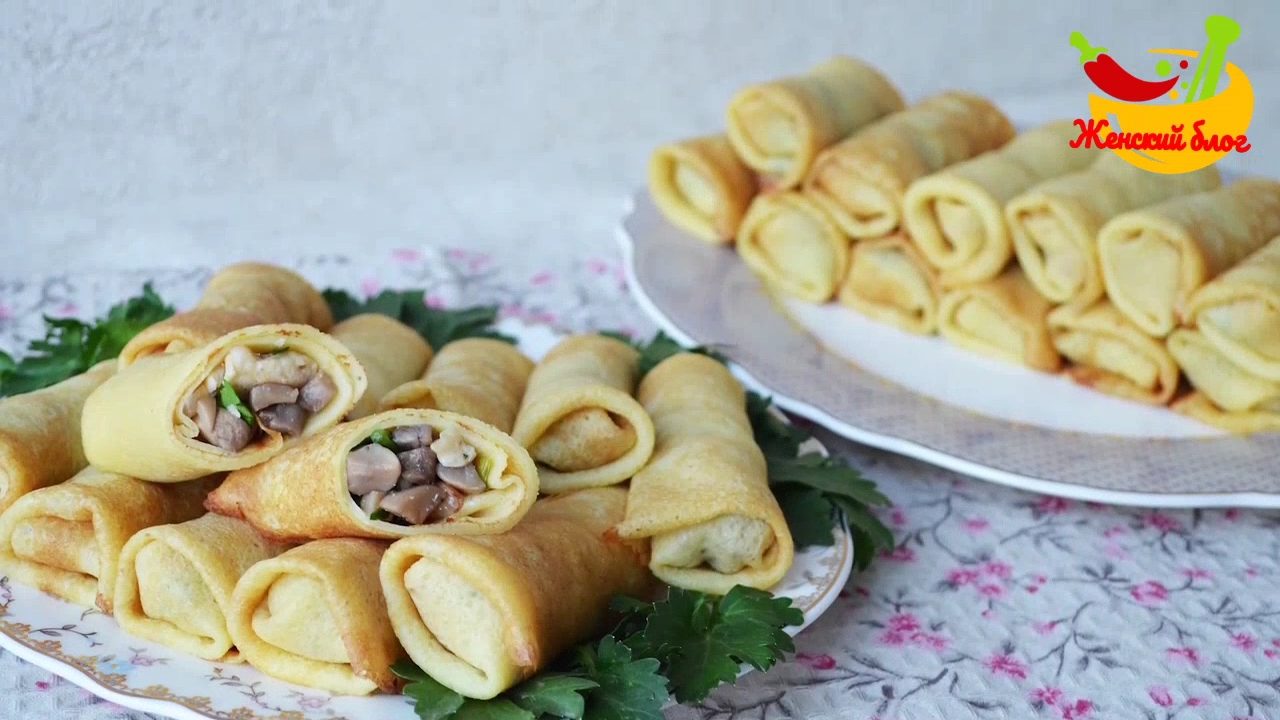 Рецепт Нежные блины с курицей и грибами. Идеальная закуска на праздничный стол