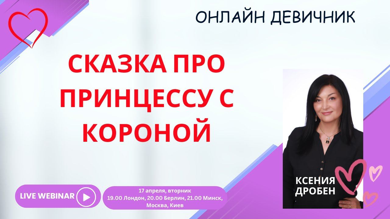 Сегодня мы встречаемся на вебинаре «Сказка про Принцессу с Короной». Мы не будем снимать корону, наша цель другая. Мы будем обсуждать, когда корону лучше сдвинуть вправо, когда влево, а когда временно на полочку положить Что вас ждет: поучительные истории из реальных будней брачного агентства Когда: среда 17 апреля Время: 19.00 по Лондону, 20.00 по Берлину, 21.00 по Минску, Киеву и Москве Вебинар пройдет на платформах: на канале YouTube Ksenia Droben https://www.youtube.com/@KseniaDrobenPartnervermittlung На странице Facebook https://www.facebook.com/ksenia.droben В группе Facebook https://www.facebook.com/groups/datingmarriageagency VK https://vk.com/kseniadroben Instagram @kseniadroben Tiktok: @kseniadrobendating Буду рада увидеться с вами и ответить на ваши вопросы 20 апреля – вечеринка знакомств в Вене, Австрия https://droben-partnervermittlung.de/ru/single-party-wien-ru/ Если у вас есть какие-то подружки в Вене, котором могло бы быть интересным наше мероприятие, пожалуйста, расскажите про нас. Спасибо огромное 4 мая – вечеринка знакомств онлайн (zoom) https://bridespb.com/ru/vstrecha-znakomstv-online/ 11 мая – вечеринка знакомств в Лондоне https://droben-partnervermittlung.de/ru/single-event-london-ru/ 17-20 мая – грандиозное мероприятие в Германии, Bad Mergentheim. Love Hotel (почти как пионерский лагерь) https://droben-partnervermittlung.de/ru/ru-love-hotel/ 22 июня – вечеринка знакомств в Мюнхене 20 июля – вечеринка знакомств в Кельне Мы обязательно будет проводить бесплатные Круглые столы и бесплатные игровые стримы. Просто даты пока не известны С уважением Дробен Ксения Директор международного брачного агентства www.droben-partnervermittlung.de www.bridespb.com Whatsapp +49 1520 366 365 3