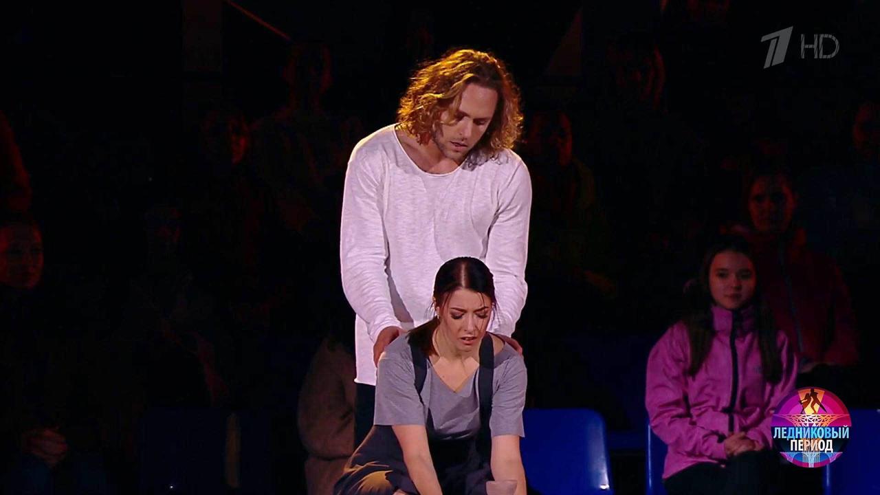На льду – певец Влад Соколовский и олимпийская чемпионка Екатерина Боброва. Они танцуют под композицию из мюзикла «Привидение».