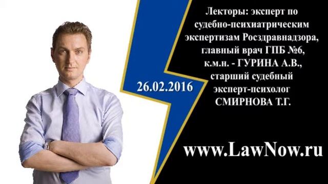 http://www.LawNow.ru 26 февраля 2016 г. в помещении зала ДПЦ «СВЯТОДУХОВСКИЙ» в Александро-Невской Лавре в Санкт-Петербурге прошли лекции для адвокатов Адвокатской палаты Санкт-Петербурга: «Психиатрические и психолого-психиатрические экспертизы по гражданским и уголовным делам» часть 2 (12:00-14:00) Лекторы: - эксперт по судебно-психиатрическим экспертизам Росздравнадзора, главный врач ГПБ №6, к.м.н. - ГУРИНА А.В.; - старший судебный эксперт-психолог СМИРНОВА Т.Г.