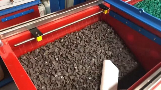 This is the last video in a series of 5 videos we posted in regards of the depowdering/cleaning and deburring of the surface and internal passages/cavities of the SLS printed cover assembly for Fanuc robots. In the video, two different process-machines are used in surface deburring of the SLS 3D part. As any SLS Nylon -12 plastic, surface finish is rough. For the additional process of painting, the surface needs to be low Ra, which is achieved by a vibratory finishing process. Machines used in the test trial process are VKT 100 and VKT 500 vib. finishing tubs, with amplitude and RPM adjusted for SLS parts. It is noticeable that in a shallower VKT 100L channel, parts rotating very well. We chose smaller medium cut media for a process. For smaller production runs, and smaller parts, fine tuned VKT 100 vib. finishing tub is a very good choice for the deburring process. In continuation, you can see large VKT 500L machine, where parts are finished in a typical SLS finishing cycle. In this process, additional "pressure" deburring is obtained. VKT 500L machine is equipped for auto rotation process. For more info on 3D SLS parts deburring email am3dfinishing@gmail.com