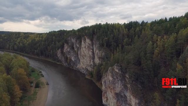 Омутной камень и памятник Демидову на Реке Чусовая (аэросъемка)