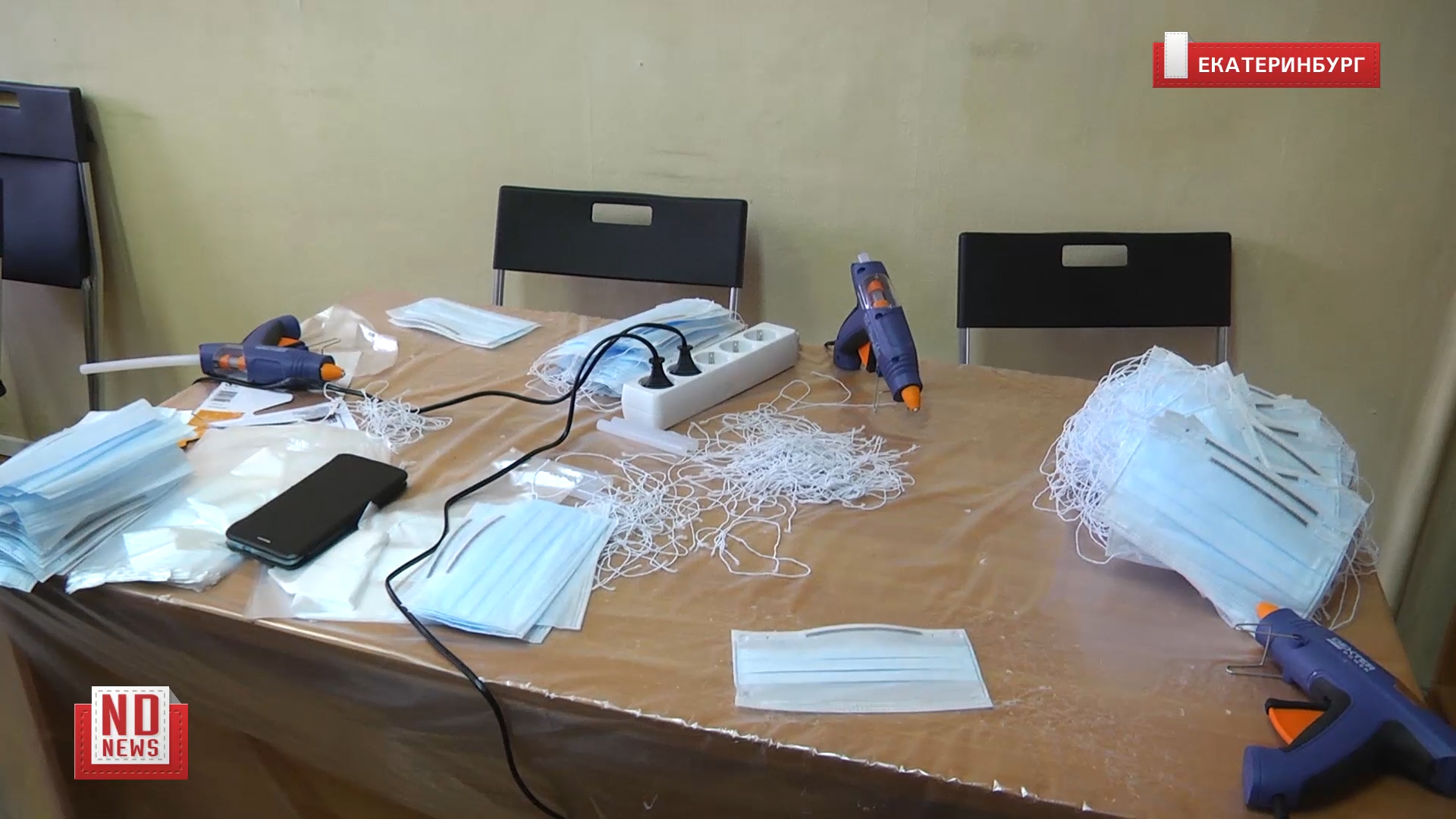 25 марта 2020 года. Екатеринбуржцы обнаружили странный цех по производству медицинских масок в одном из офисных зданий города. Съемочная группа «Нового Дня» отыскала помещение, на которое обратили внимание люди. Это оказалась небольшая комната, где за тремя столами работали десять молодых людей без масок и перчаток. С помощью клеевого пистолета они крепили резинки на заготовки. Подробнее – https://newdaynews.ru/ekaterinburg/687292.html