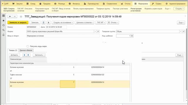 Получение кода маркировки в линейке продуктов Штрих-М: Торговое предприятие 7 с привязкой к номенклатуре