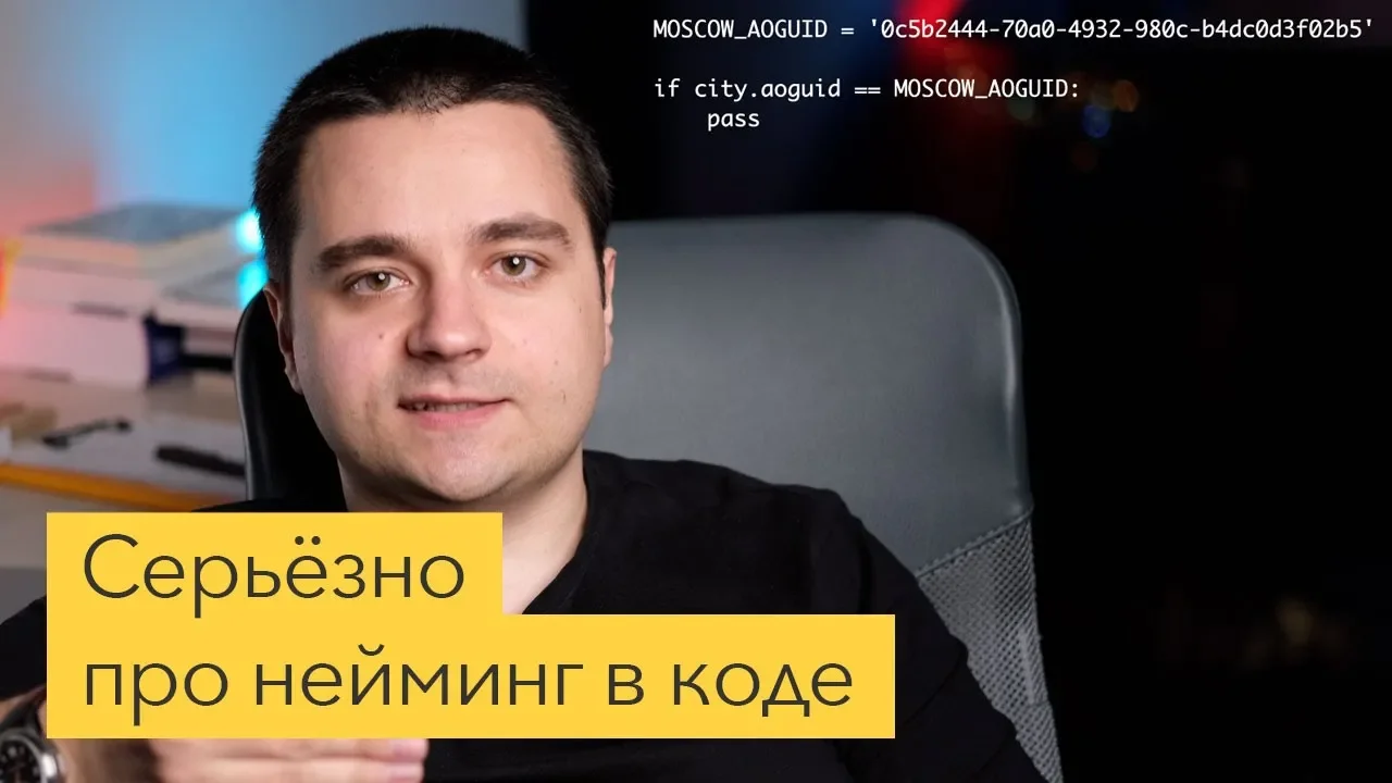 Запущен первый курс мощной образовательной программы от Диджитализируй: «Основы компьютерных и веб-технологий с Python» Вся информация и запись на курс здесь: https://to.digital/course01 Книжный клуб Ботаним!, где мы читаем хорошие ИТ-книги: https://botanim.to.digital/ Мой курс «Основы компьютерных и веб-технологий с Python»: https://course01.to.digital/ Telegram: https://t0digital.t.me Сказать спасибо за это видео можно здесь — https://boosty.to/digitalize.team «Имя создаваемой переменной следует выбирать так же тщательно, как имя новорождённого». Именование переменных, классов и методов в коде — эта тема кажется простой и, пожалуй, даже не заслуживающей внимания. Все согласны, что называть переменные надо правильными именами и... И, в общем-то всё. Что такое эти правильные имена? Почему часто мы читаем чужой код и чувствуем, что его проще переписать, чем модифицировать? Почему вообще так много плохого, нечитаемого, дурно пахнущего кода появляется каждый день? Правильный нейминг это не панацея и не серебряная пуля. Однако серьёзный подход к именованию это критически важная особенность качественного кода, равно как безответственный нейминг это наиболее частая особенность кода плохого. В чем же разница между плохим и хорошим неймингом и как научиться писать код, который не захочется через месяц выбросить? Давайте разбираться. Писать код в Vim или IDE? — https://www.youtube.com/watch?v=yog7sNQOryM Ищем ботов в Instagram на Python — https://www.youtube.com/watch?v=IBmWSr4_9XA Запуск среды разработки в Tmux — https://www.youtube.com/watch?v=P10cuGj-J8E /****************** about ******************/ Меня зовут Алексей Голобурдин, я программирую с 2004 года и на этом канале делюсь своим опытом. Я основатель и руководитель компаний: — Диджитализируй https://digitalize.team, разрабатываем сложные IT системы для бизнеса; — Salesbeat https://salesbeat.pro, комплексный модуль доставки для интернет магазинов. Если у вас есть проект на разработку, пишите нам на hi@digitalize.team. С другими предложениями, а также если вам нужна одна или несколько индивидуальных консультаций/уроков по разработке (3000 руб/час), пишите мне на alexey@salesbeat.pro. Мои соц сети: Telegram канал — https://t.me/t0digital ВК — https://vk.com/digitalize.team Дзен — https://zen.yandex.ru/id/6235d32cb64df01e6e78c883