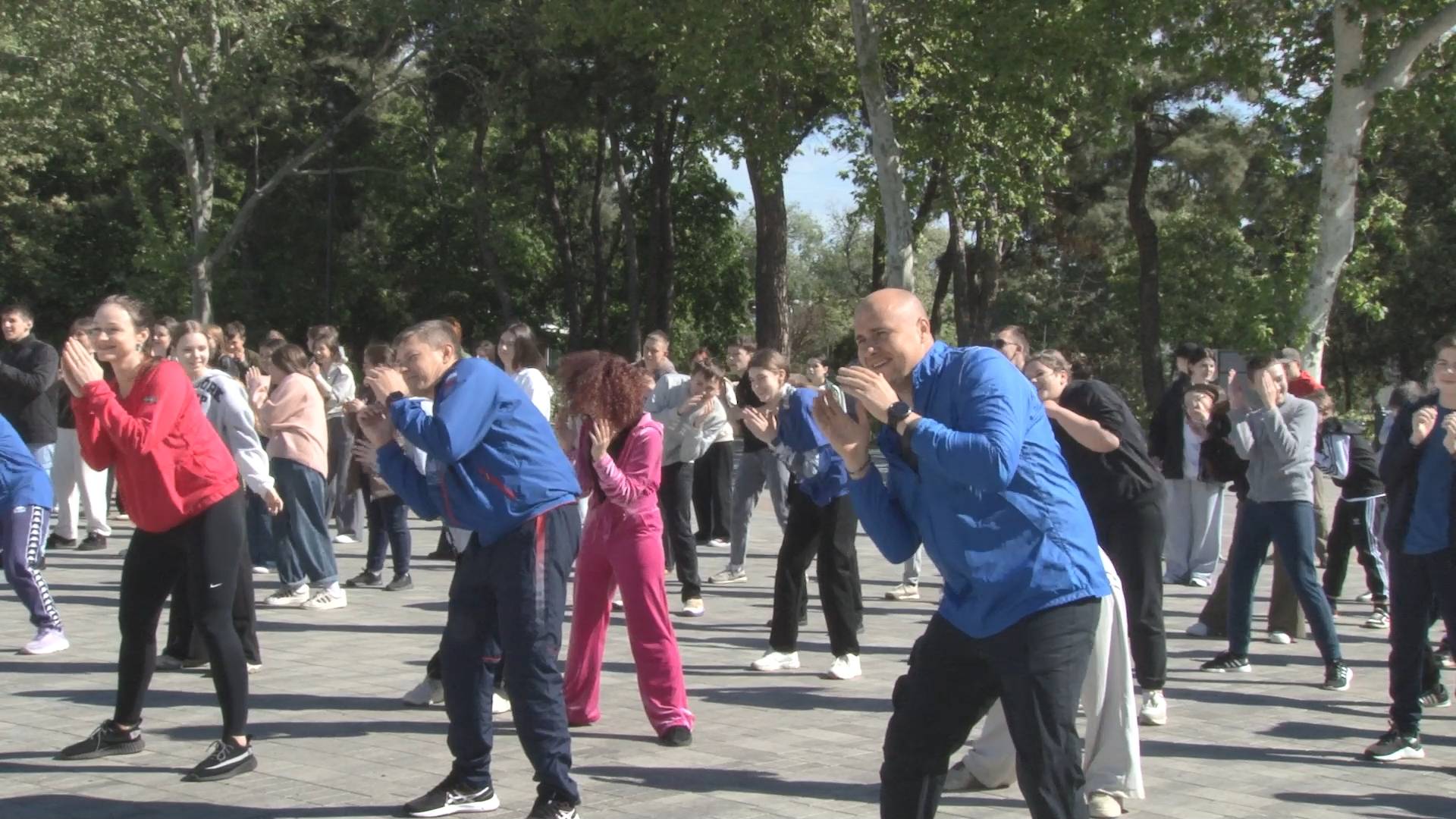 В этот раз упражнения в месте с собравшимися участниками выполнял рекордсмен Книги рекордов Гиннесса и рекордсмен Книги рекордов России по марафонскому плаванию Дмитрий Заика.