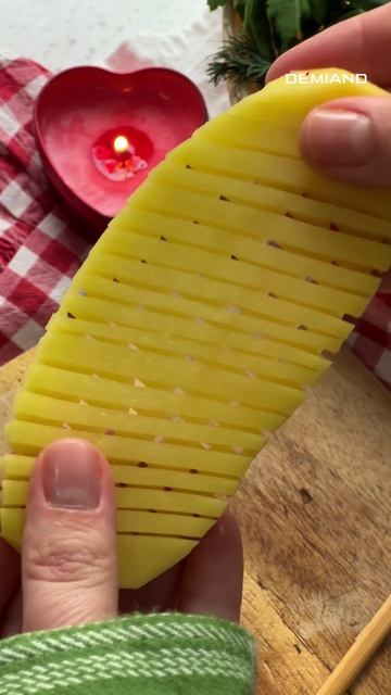 https://pr.demiand.ru/w/fl724 Ингредиенты - Картофель крупный - Сливочное или оливковое масло - французские травы - соль/перец Приготовление - Разрезать картофелину на слайсы около 1 см толщины - По краям зафиксировать палочки для роллов - Сделать прямые надрезы с одной стороны и по диагонали - с другой - выпекать около 17 мин в режиме «фри» при 190 градусах Приятного аппетита☺️ Больше вкусных и полезных рецептов ищите в приложении Demiand♥️