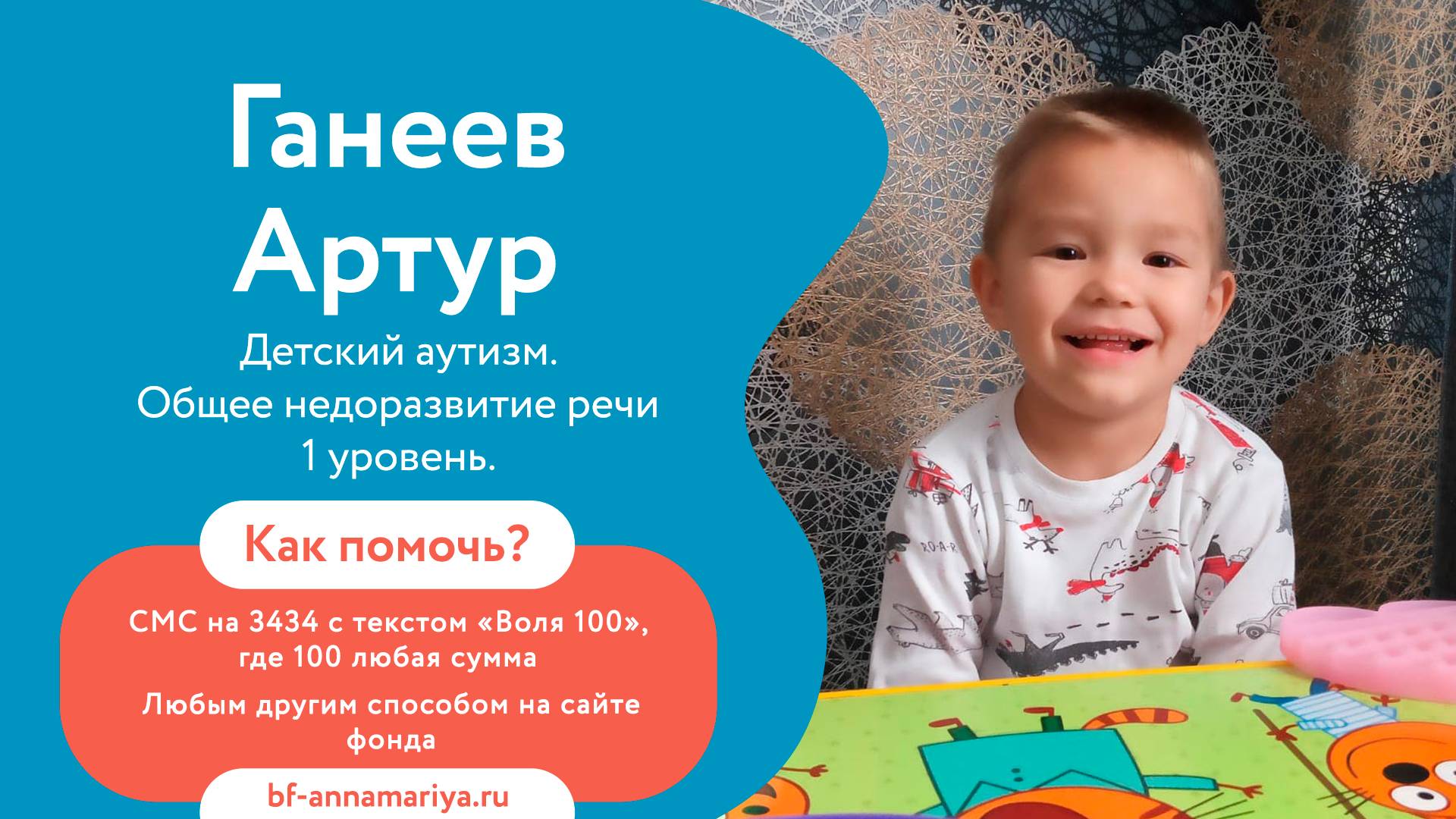 🆘 Артур нуждается в срочной операции по трансплантации стволовых клеток из костного мозга. Операция даст ему шанс на здоровую жизнь! 🆘 Ганеев Артур получает помощь в центрах ментального здоровья и постоянно занимается с дефектологом, но врачи говорят, что операция — это единственный способ помочь ему стать более свободным и открытым. 💉 Клиника MMC International в Грузии согласилась провести необходимую трансплантацию, но такая операция в России, к сожалению, не доступна.💊 Из-за болезни в последнее время признаки заболевания начали проявляться все чаще. Главное «успокоительное» для малыша – это объятия и поцелуи родных людей. 🙏 Ваша помощь может стать решающей и подарить Артуру возможность стать счастливым и здоровым малышом!🙏 Как помочь? 🔵 СМС на 3434 с текстом «Воля 100» 🔵 другие способы помощи на сайте фонда - https://bf-annamariya.ru/1856-ganeev-artur.html