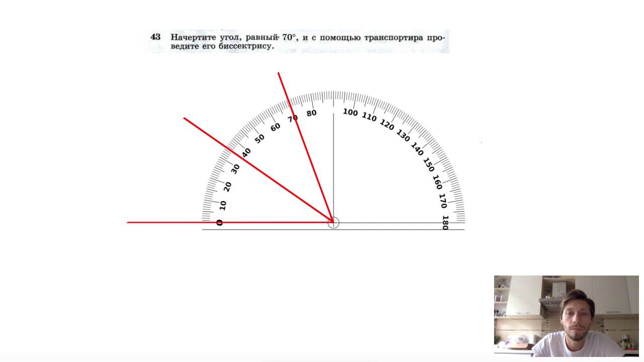 №43. Начертите угол, равный 70°, и с помощью транспортира проведите его биссектрису. Мой второй канал для подготовки к ЕГЭ и ОГЭ - https://www.youtube.com/ЕвгенийСумин Инстаграм - https://www.instagram.com/EGE_OGE.math Личный инстаграм - https://www.instagram.com/ee_sumin VK - https://vk.com/evgeniysumin FB - https://www.facebook.com/EvgeniySumin
