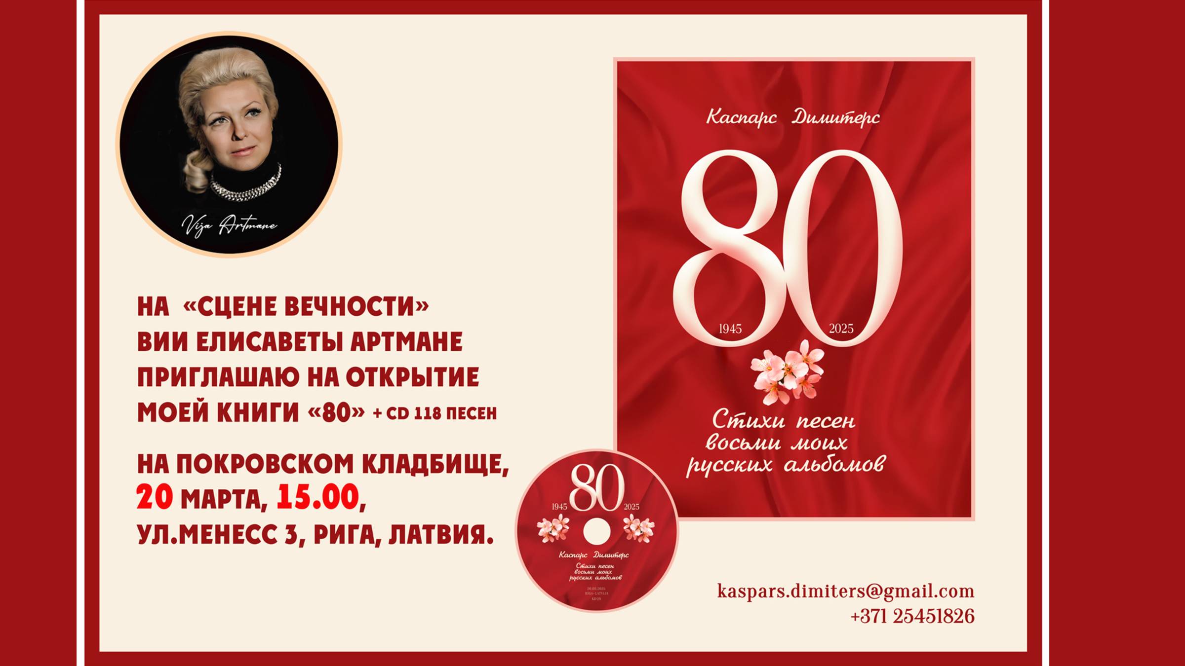 На «Сцене вечности» Вии Елисаветы Артмане приглашаю на открытие моей книги «80» (+ CD 118 песен) на Покровском кладбище, 20 марта, 15.00, ул.Менесс 3, Рига, Латвия. kaspars@dimiters.ru