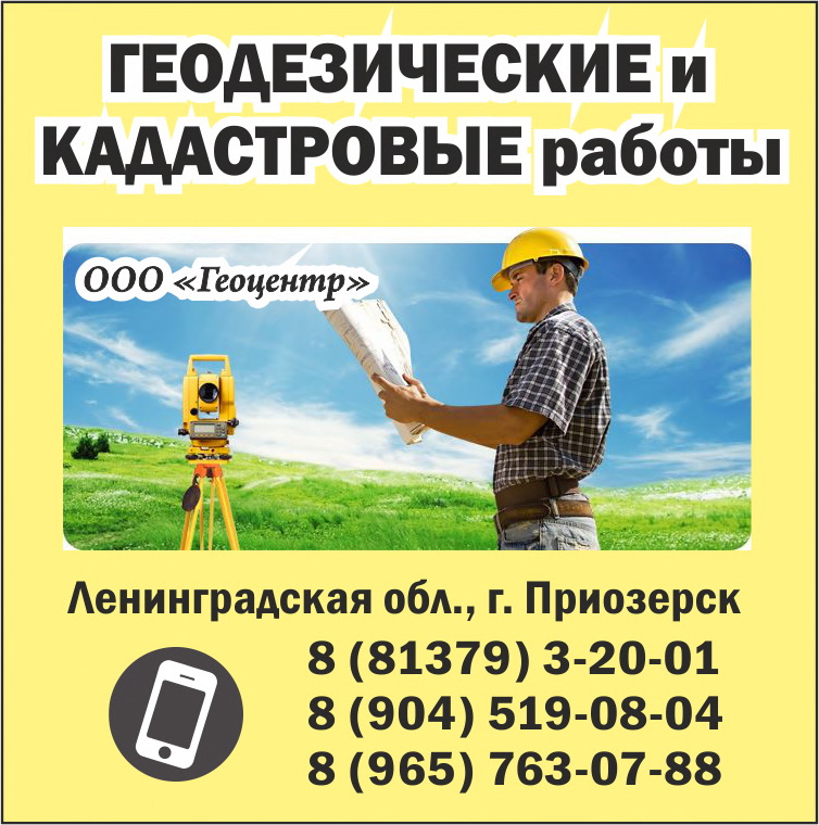 ООО "Геоцентр" в Приозерске: - Геодезические работы. - Кадастровые работы. В штате работает аттестованный кадастровый инженер. - Юридическая консультация. Ленинградская область, Приозерский район, г. Приозерск, ул. Калинина, д. 51, офис 102, 103 Тел.: 8 (81379) 3-20-01 Тел.: 8 (904) 519-08-04 Тел.: 8 (965) 763-07-88 E-mail: Geocentr04@mail.ru