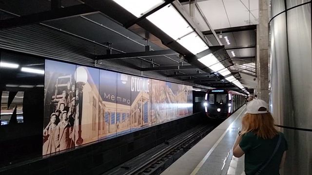 Электропоезд "Москва-2020" (модель 81-775/776/777) прибывает на станцию Сокольники Большой кольцевой линии Московского метрополитена. Оформление станции посвящено строительству метро в Москве и во многом повторяет советские плакаты 1930-х годов. Снято 19 июня 2023 г. #Москва #Россия #Мосметро #БКЛ #Москва2020 #метро #Сокольники
