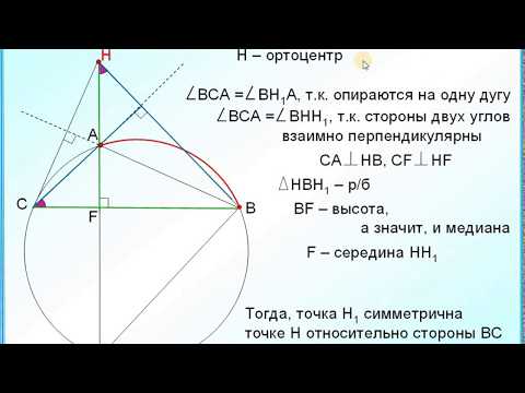 Пусть Н – точка пересечения высот треугольника АВС. Докажите, что точка Н₁, симметричная точке Н относительно любой стороны треугольника АВС, лежит на окружности, описанной около этого треугольника.