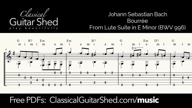 https://classicalguitarshed.com/gf1/ FREE PDF Sheet music book - 30 and Easy(ish) Classical Guitar Favorites. Over 150,000 other guitarists have downloaded and use CGS guitar books. Get yours free here: https://classicalguitarshed.com/books PDF Download of this piece: https://classicalguitarshed.com/sm-bach-bourree-em https://classicalguitarshed.com/membership/ Click this link to learn more about our full course for classical guitar. It's organized, structured, and strategic from the beginning, so you make the most of your time and avoid injury and frustration. Build your basics, fill the gaps, and rise to more advanced levels of playing. Free sheet music library: https://classicalguitarshed.com/music Free tutorials: https://classicalguitarshed.com/cgs-archives Structured classical guitar course: https://classicalguitarshed.com/membership Are you learning classical guitar or would like to learn classical guitar? ClassicalGuitarShed.com can help you on the journey. If you want to rise to new levels in your playing, it just takes time and strategic work. To play classical guitar well, you need to know: * how to hold and touch the guitar - form and positioning * how to move your fingers and hands - efficient, clean, and fluid * how to learn pieces - reading music, understanding what you see, ingraining, polishing * how to craft the music so it is beautiful - swells and fades, rhythm, touch * how to practice so all these skills improve over time and don't go away At the root of beautiful playing is a solid technique (aka “the way your hands move”). You may have beautiful music in your head, but if your hands can't play it, it won't come out of the guitar. But bad technique puts a limit on your playing. Speed, tone quality, and control can suffer. Good technique gets stronger and more instinctive with every practice. It forms the bedrock foundation for your music. And you may want to understand music so you learn it more easily and it makes more sense. This can help you avoid the excess frustration and dismay that comes with shoddy practice and prolonged confusion. But playing the notes is not enough. Like an actor bring words to life, we breathe life into our pieces. And we can do this in an organized way, day in and day out, reliably. Great musicians can play wonderfully in any mood. They do not rely on emotions. Instead, they create music that affects our emotions. This is a trained skill, not an inborn talent. Playing classical guitar is a long-term study. It's something we do in our homes as part of our days. We play for ourselves, for the quality it adds to life. We may enjoy playing guitar for others, but most of the time we are alone with our work. There are methods and formulas for great practice. We can use our time well so that see more progress. We can fix the problems and erase the mistakes. And we can enjoy conquering the plentiful challenges that classical guitar music offers. If you plan to play classical guitar for any length of time, it is worth it to get help. It's not something we can do on our own, like folk music. I have a structured and organized course to help you play classical guitar. If you like, you can learn more here: https://classicalguitarshed.com/membership/ If you would like to hear me (Allen Mathews) playing, visit my other youtube channel: http://www.youtube.com/allenmathews/ Or check out these other YouTube videos: 11 lessons for beginners: https://youtu.be/vEau0pJdgqc Guitar basics: https://youtu.be/e51Z-50GzDo Classical guitar nails: https://youtu.be/z0jz1ms_AlM How to change classical guitar strings: https://youtu.be/AKsVF72Tsdg Most common errors: https://youtu.be/kPBqjgF9-l8 How to practice sight-reading on guitar: https://youtu.be/IZU3BZBRq2A Note-perfect playing: https://youtu.be/GbCQr1_v_9w How long does it take to learn guitar?: https://youtu.be/MJhSCXzwqCI Right-hand guitar exercises: https://youtu.be/lYv0fwHIU_w The perfect left hand on guitar: https://youtu.be/GwUsWeIyhkg Slow practice: https://youtu.be/fZTKRxtMwyU Classical guitar scales (5 shapes): https://youtu.be/cAFbEYqvYSU Guitar tremolo technique: https://youtu.be/nV2HUMx1su0 I/M alternation technique: https://youtu.be/8Jat_Bxme5c Scale variations: https://youtu.be/ukF5ukFjKS0 How chords and scales are related: https://youtu.be/j9K01pYwIRY Guitar squeaks: https://youtu.be/8wd9tsnNSLM How to hold a guitar: https://youtu.be/fxDoRaRoiUQ Classical guitar without fingernails: https://youtu.be/FAPB1aGdka0 Classical on acoustic: https://youtu.be/wGDVuRw7RGE Rasgueado technique: https://youtu.be/YL-5EhkZVck Avoid rest strokes: https://youtu.be/ahurGVdOA5E Sergio Assad left-hand workout: https://youtu.be/24vOFOOtVgk Focal dystonia: https://youtu.be/-2MeXB6LxQ4uu Bar chord tips: https://youtu.be/PWroXMukbjI