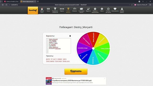 Колесо фортуны для розыгрышей онлайн — RandStuff — Яндекс Браузер 2025-12-02 18-50-09