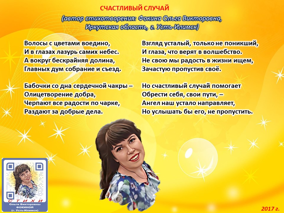 Читает автор стихотворения: ФОКИНА ОЛЬГА ВИКТОРОВНА (Иркутская область, город Усть-Илимск) СТИХИ: https://stihi.ru/2018/07/08/3790 БИОГРАФИЯ: http://www.proza.ru/2019/10/08/1473 ВЫИГРЫВАЙТЕ КНИГИ БЕСПЛАТНО: https://proza.ru/2017/09/17/447 ОТЗЫВЫ ЧИТАТЕЛЕЙ: http://www.proza.ru/2019/11/29/611 Из книги Фокиной Ольги Викторовны (Усть-Илимск) «Несу добро в ладошках!»: [все стихотворения с 2005 по октябрь 2020 гг., проза, авторские песни, интервью]. – Москва: МГО Союза писателей России, 2020 г. – 886 стр., ил. ISBN 978-5-7949-0826-8 СЧАСТЛИВЫЙ СЛУЧАЙ (автор стихотворения: Фокина Ольга Викторовна, Иркутская область, г. Усть-Илимск) Волосы с цветами воедино, И в глазах лазурь самих небес. А вокруг бескрайняя долина, Главных дум собрание и съезд. Бабочки со дна сердечной чакры – Олицетворение добра, Черпают все радости по чарке, Раздают за добрые дела. Взгляд усталый, только не поникший, И глаза, что верят в волшебство. Не свою мы радость в жизни ищем, Зачастую пропустив своё. Но счастливый случай помогает Обрести себя, свои пути, – Ангел наш устало направляет, Но услышать бы его, не пропустить. 13 июля 2017 г.