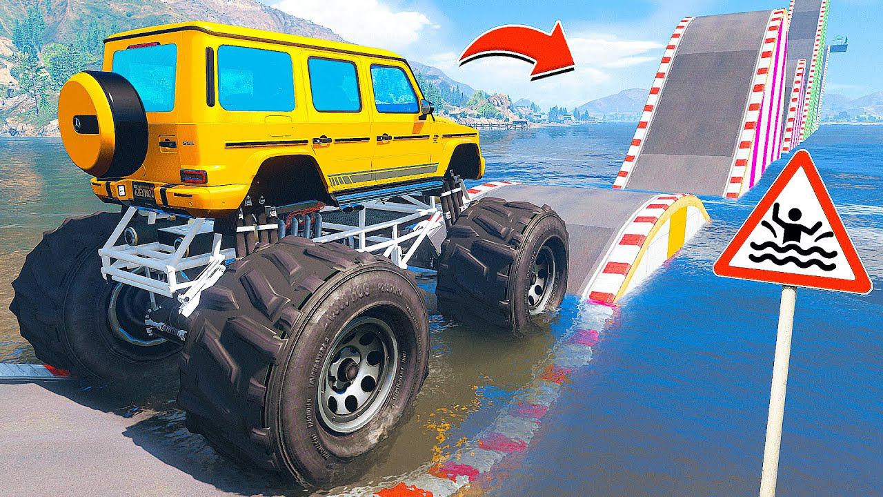 СМОЖЕТ ЛИ ГИГАНТСКИЙ ГЕЛИК БИГФУТ ПРОЕХАТЬ ВОДНЫЕ ТРАМПЛИНЫ в ГТА 5 МОДЫ - ЭКСПЕРИМЕНТЫ в GTA 5 MODS