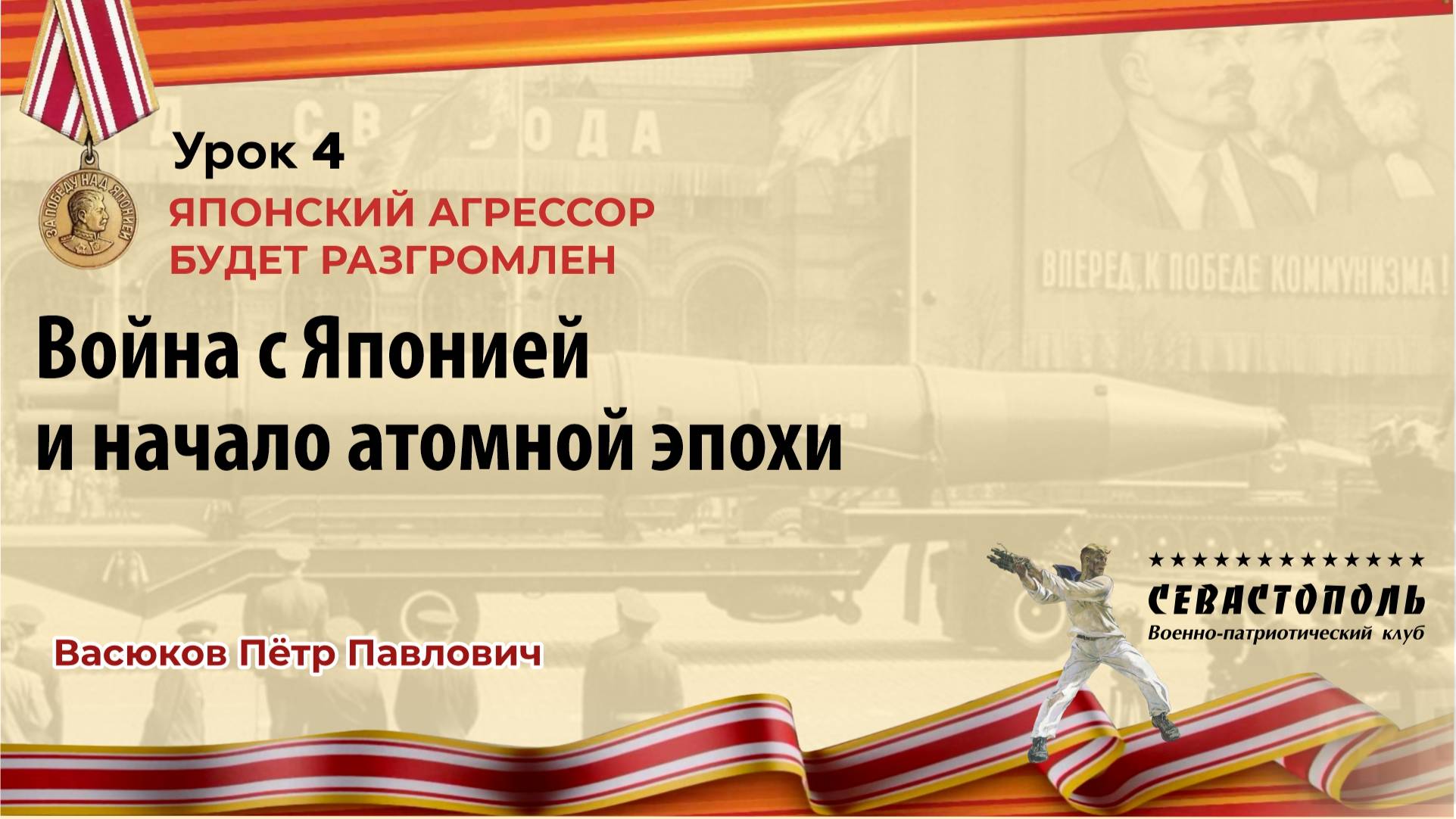 80 лет назад произошло событие, изменившее ход мировой истории, - завершилась Вторая мировая война. Первым этапом ее завершения стала победа над гитлеровской Германией, вторым - сокрушение милитаристской Японии. И оба этапа достигнуты благодаря подвигу советского солдата. Клуб "Севастополь" (г. Екатеринбург) обращается к патриотическим отрядам школьников и студентов с призывом участвовать в программе видеоуроков по истории советско-японской войны 1945 года "80 лет победы над милитаристской Японией". Завершится программа, как обычно, товарищеским соревнованием отрядов - Интернет-Чемпионатом. Урок N4. Война с Японией и начало атомной эпохи Урок ведет Васюков Петр Павлович, Почетный работник высшего профессионального образования РФ, кандидат исторических наук, доцент, полковник в отставке, г.Москва