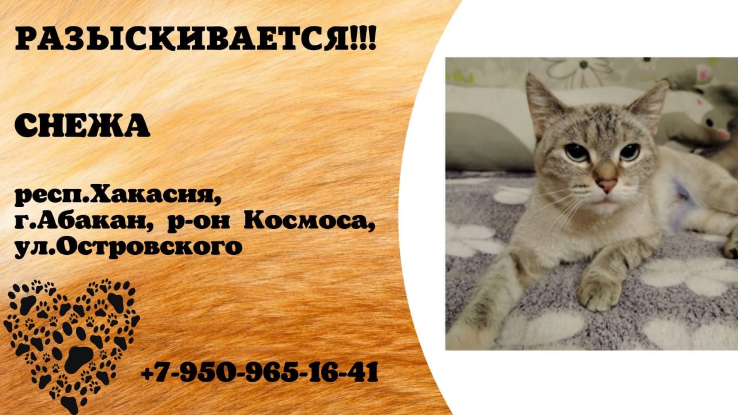 Пропала кошка! СНЕЖА. респ.Хакасия, г.Абакан.