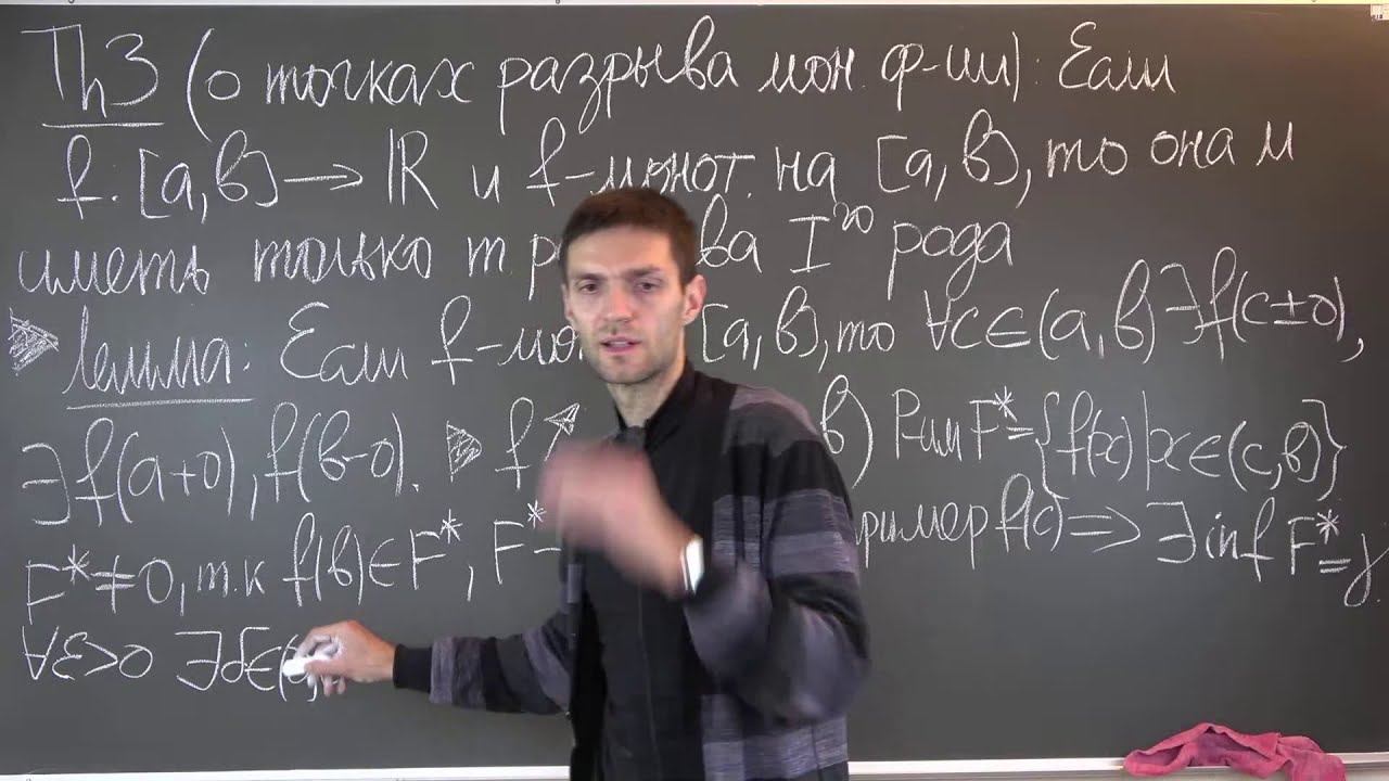 00:00 – Вводное слово 4:00 - Теорема 3 (О точках разрыва монотонной функции) + доказательство через Лемму 6:47 - Лемма (Если функция монотонна на отрезке, то у нее есть левый и правый пределы) + доказательство 26:10 - Следствие Теоремы 3 (Критерий непрерывности монотонной функции) 30:28 - Пример 33:27 - Следствие 2 Множество точек разрыва монотонной функции не более, чем счетное 37:37 - Ввод в тему - Локальные и глобальные свойства непрерывных функций. 40:57 - Утверждение (пример локального свойства) (Финальная ограниченность) 42:22 - Теорема 4 (Об устойчивости знака непрерывной функции) + доказательство 49:50 - Небольшая историческая справка ;) 56:39 - Теорема 5 - Глобальное свойство (О прохождении непрерывной функции через 0) +док-во 1:13:00 - Следствие(Теорема Больцано-Коши) + доказательство 1:22:22 - Пример 1:26:03 - Теорема 6 (Первая теорема Вейерштрасса) + доказательство 1:32:35 - Примеры