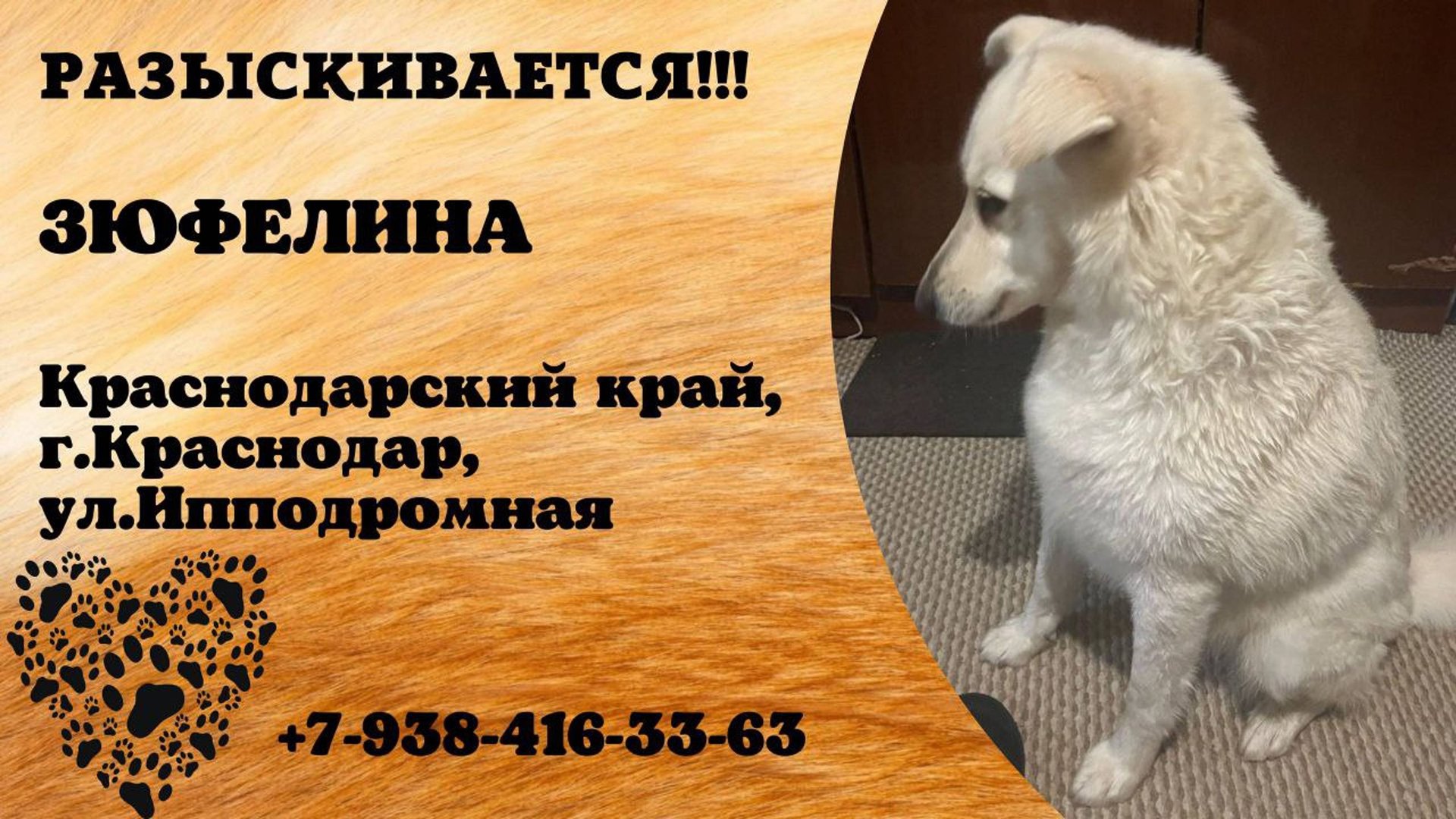 Краснодарский Краснодар Пропала собака 28.07 Зюфелина, белая. Сбежала ул.Ипподромная или близ лежащие улицы))) просьба позвонить если увидите, а если есть возможность придержать, очень добрая и ласковая Имя хозяина: Елена Телефон: 79384163363 Инфо #пропала_собака#краснодарский#краснодар