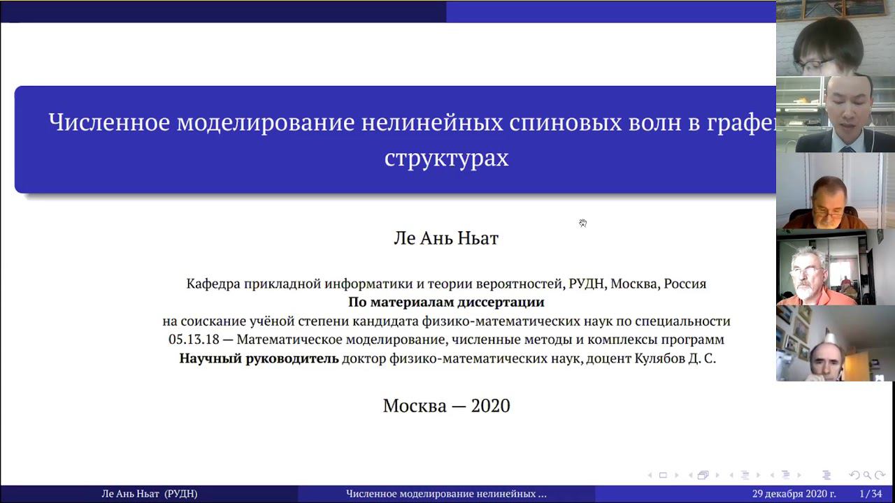 https://events.rudn.ru/event/105/ Защита диссертации Ле Ань Ньата на тему «Численное моделирование нелинейных спиновых волн в графеновых структурах», представленной на соискание ученой степени кандидата физико-математических наук по специальности 05.13.18 — Математическое моделирование, численные методы и комплексы программ. Научный руководитель: д.ф.-м.н., доцент Кулябов Дмитрий Сергеевич.