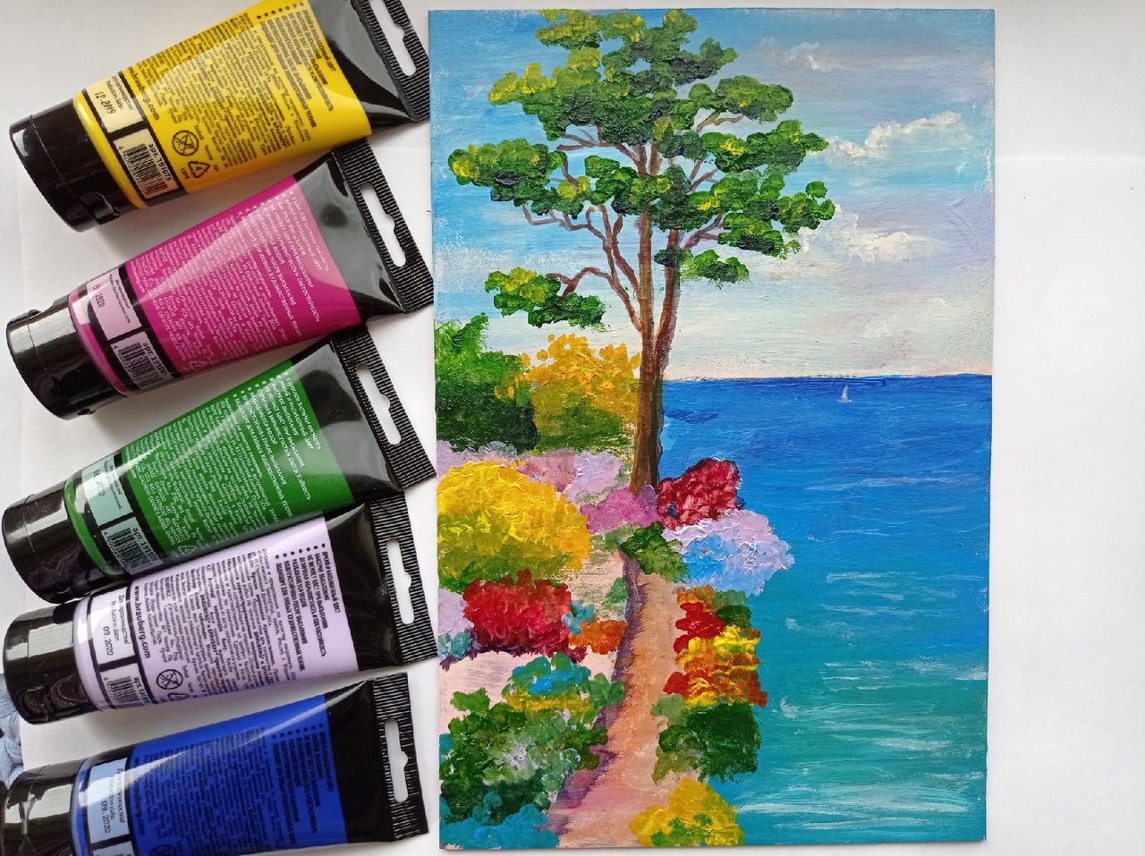 Яркий пейзаж акрилом для начинающих. Рисуем море, солнце, отпуск. Простой пошаговый пейзаж для создания хорошего настроения. Видео без ускорения, что позволит детально разобраться с процессом написания пейзажа. Так же можно повторить и гуашью (маслом). Рисуйте с удовольствием! #пейзажакрилом #акрилдляначинающих #яркийпейзаж #пейзажсморем #акрил