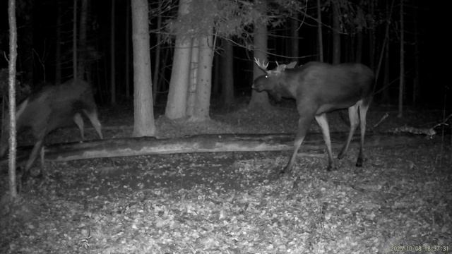 Лоси (бык и корова) встретились у солонца, пообщались. Хотя период гона у лосей (сентябрь) и закончился, но у отдельных особей может немного затянуться