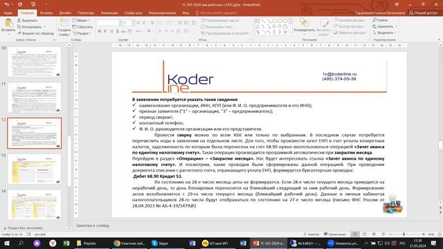 Компания «Кодерлайн» провела вебинар «1С:Бухгалтерия 2024. Как работать с ЕНС?» Ведущая: Гардышева Галина - консультант-аналитик 1С:ERP Целевая аудитория для бухгалтеров, пользователей и специалистов ИТ-подразделений компаний различных отраслей. Описание На примере 1С:Бухгалтерия проверим, что изменилось. Как работать с ЕНС, как проверить сальдо, как оплатить НДС без уведомления - проверим на практике. На что, кроме новой формы НДФЛ, обратить внимание в 1 квартале 2024 года. Программа 1. Отражение сальдо по ЕНС; 2. Отражение начислений и сверки; 3. Уплата НДС и уведомления; 4. Проводки при работе с ЕНС; 5. Дополнительные сервисы, отчеты.