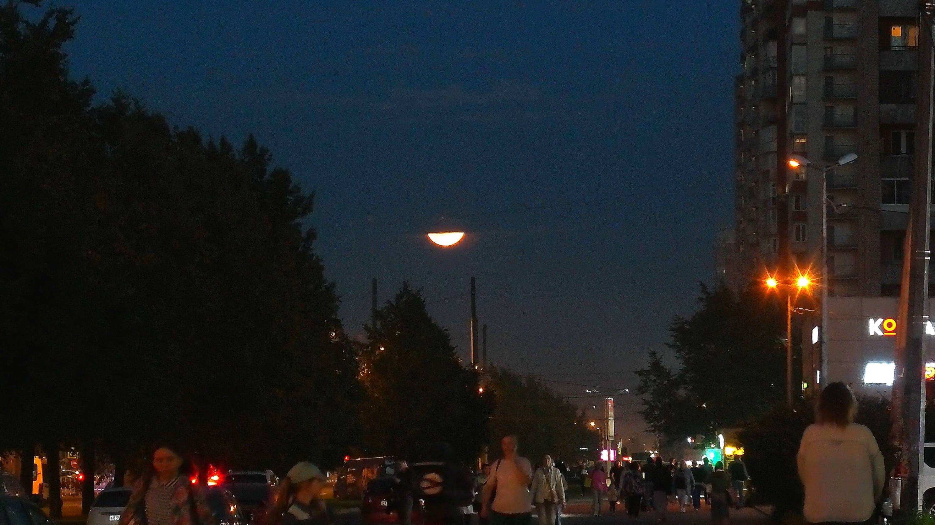 Вид лунного затмения с улицы города.