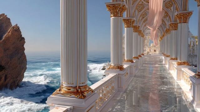 Перенеситесь в мир, где небо и море сливаются воедино, где океанские ветры обвивают высокие мраморные шпили, а солнечный свет танцует на золотых крышах, словно жидкий огонь. Возвышаясь высоко над бирюзовыми водами, устремленный ввысь Океанский дворец изящно тянется к небесам — террасы из белого камня увенчаны развевающимися розовыми шелковыми полотнищами, их отражения колышутся в волнах далеко внизу. Легкий ветерок доносит аромат соли и распускающихся цветов через открытые дворики, в то время как каждый мост, холл и балкон являют собой еще одно скрытое чудо искусства и элегантности. Это фантастическое путешествие, созданное с помощью искусственного интеллекта, приглашает вас побродить по сказочному прибрежному королевству, где облака плывут по прозрачным небесным путям, сады утопают в белых лилиях и розовых розах, а мозаика, покрытая приливом, мерцает у вас под ногами. Каждая сцена разворачивается, как ожившее видение: небесные мосты, подвешенные между высокими башнями над бескрайним морем, Тайные гроты и потайные переходы, сияющие золотым светом, Человекоподобные феи в теплых струящихся одеждах, скользящие по океанским садам, Волны разбиваются внизу, их ритм эхом разносится по дворцовым коридорам.