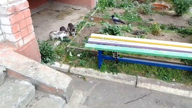 Уличные кошарики собрались поесть, и к ним пришла ворона, которой очень завидно! ^^