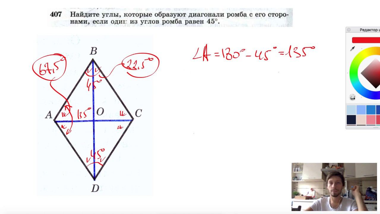 №407. Найдите углы, которые образуют диагонали ромба с его сторонами, если один из углов ромба равен 45°. Поддержать канал рублём - 5469400944002125 (Сбербанк) Мой второй канал для подготовки к ЕГЭ и ОГЭ - https://www.youtube.com/ЕвгенийСумин Инстаграм - https://www.instagram.com/EGE_OGE.math Личный инстаграм - https://www.instagram.com/ee_sumin VK - https://vk.com/evgeniysumin FB - https://www.facebook.com/EvgeniySumin