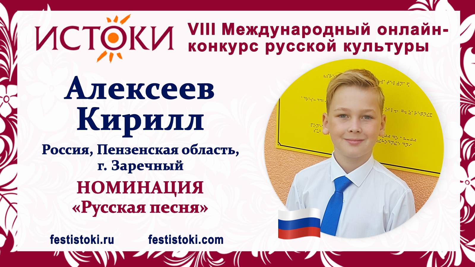 Участник VIII Международного онлайн-конкурса русской культуры "Истоки". Номинация "Русская песня". Песня "Калинка". Автор Иван Ларионов. Сайт: festistoki.ru / festistoki.com E-mail: festistoki@mail.ru