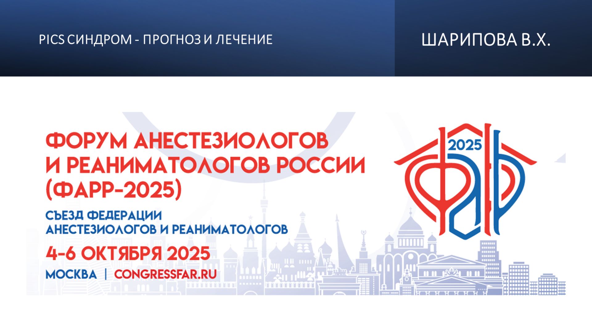 Видеозапись ФАРР-2025, XXIII съезд Федерации анестезиологов и реаниматологов 04-06 октября 2025, Москва. Висолат Хамзаевна Шарипова "PICS синдром - прогноз и лечение" Информация, размещенная на канале, предназначена исключительно для медицинских специалистов