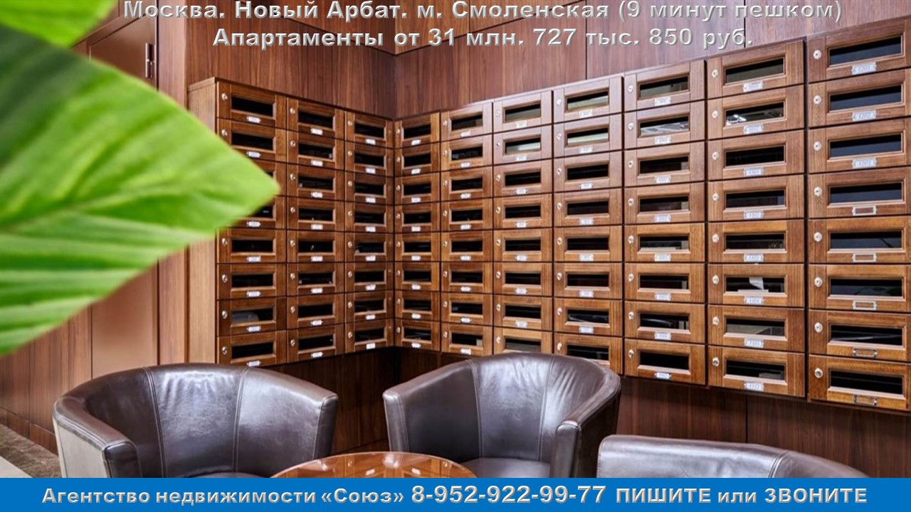 Агентство недвижимости «СОЮЗ» Покупайте: апартаменты в Москве. Новый Арбат ул., м. Смоленская (9 минут пешком) Агент по новостройкам: 89529229977 (WhatsApp) Цены на апартаменты точно такие же как и у застройщика. Апартаменты продаются БЕЗ РИЭЛТОРСКОЙ КОМИССИИ !!!. 1к. квартиры: от 31 млн. 727 тыс. 850 руб. Ежемесячный платеж: 186 013 руб. при ставке 8% Площадь общая: 46,9 м2 - 129,7 м2 2к. квартиры: от 111 млн. 060 тыс. 882 руб. Ежемесячный платеж: 651 125 руб. при ставке 8% Площадь общая: 112,9 м2 - 133,3 м2 3к. квартиры: от 172 млн. 607 тыс. 942 руб. Ежемесячный платеж: 1 млн. 011 тыс. 962 руб. при ставке 8% Площадь общая: 154,3 м2 4к. квартиры: от 306 млн. 625 тыс. руб. Ежемесячный платеж: 1 млн. 797 тыс. 675 руб. при ставке 8% Площадь общая: 223 м2 5к. квартиры: от 515 млн. 625 тыс. руб. Ежемесячный платеж: 3 млн. 022 тыс. 995 руб. при ставке 8% Площадь общая: 375 м2 - 415,8 м2 Срок сдачи: сдан Срок выдачи ключей: 3 квартал 2014 Договор: К-П Тип дома:монолитный Тип отделки: отделка "под ключ" Парковка: есть Потолки: 3,15м. Преимущества:Множество планировочных решений. Высота потолков 3,15 - 3,9. Различные варианты отделка. Двухуровневые пентхаусы с террасами. Панорамные виды Москвы-реки и Нового Арбата. Инфраструктура отеля. Описание комплекса: Жилой комплекс расположен в одном здании со столичным отелем Marriott Novy Arbat, а также Национальным медицинским исследовательским центром реабилитации и курортологии Министерства здравоохранения Российской Федерации и предлагает своим резидентам исключительные возможности для жизни, работы и отдыха. Формат частных апартаментов на территории пятизвёздочного отеля занимает особое место в сегменте премиальной недвижимости. Это лучший вариант для городской резиденции самого высокого класса и безопасная долгосрочная инвестиция. Комплекс представляют собой абсолютный эталон данного формата, ранее не доступного в России. Апартаменты занимают отдельное крыло в составе многофункционального комплекса, расположенного в самом центре Москвы – на Новом Арбате. Собственные входные группы, скоростные лифты, вместительная подземная парковка, оригинальный дизайн интерьеров, современные инженерные системы, собственная служба эксплуатации и охраны, контроль доступа и видеонаблюдение — это стандарт высшего класса, который реализован в апартаментах комплекса. К услугам резидентов комплекса вся инфраструктура отеля — два ресторана и лобби-бар, магазины, банкоматы, а также все необходимое, чтобы расслабиться, восстановить силы или привести себя в форму — круглосуточный тренажерный зал, салон красоты. Для комфортного ведения бизнеса, проведения деловых встреч и приема официальных гостей предусмотрены представительская гостиная, семь конференц-залов, переговорные комнаты, офисные помещения. При необходимости персонал отеля обеспечит встречу и размещение гостей, услуги кейтеринга и возьмет на себя все заботы, связанные с проведением мероприятия любого формата на самом высоком уровне. В комплексе представлены апартаменты площадью от 63 до 415,8 м2 с отделкой и без. Варианты готовых решений были разработаны российскими и зарубежными дизайнерскими бюро специально для комплекса. Элегантные универсальные интерьеры учитывают архитектурные и инженерные особенности здания и могут быть легко адаптированы под индивидуальные запросы. По желанию заказчика может быть разработан и воплощен в жизнь эксклюзивный дизайн-