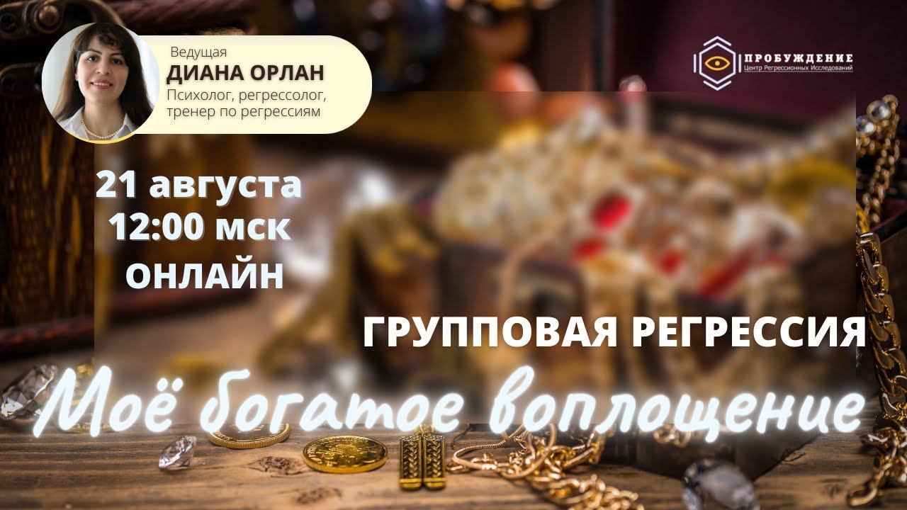 На встрече каждый сможет поисследовать свое отношение к богатству жизни, где был получен опыт финансового изобилия. В какой из прошлых жизней произошел наиболее быстрый социальный рост? За счет каких талантов удалось подняться по социальной лестнице? Прикоснувшись к прошлому опыту, регрессанты смогут перенести многие свои прошлые таланты, качества и наработки в сегодняшнюю жизнь, адаптируя к современным реалиям. КОГДА: 21 августа 12:00 МСК, ОНЛАЙН Тема встречи: «Мое самое богатое воплощение». Подробности по ссылке: https://probujdenie.ru/gruppovye-regressii-onlajn/