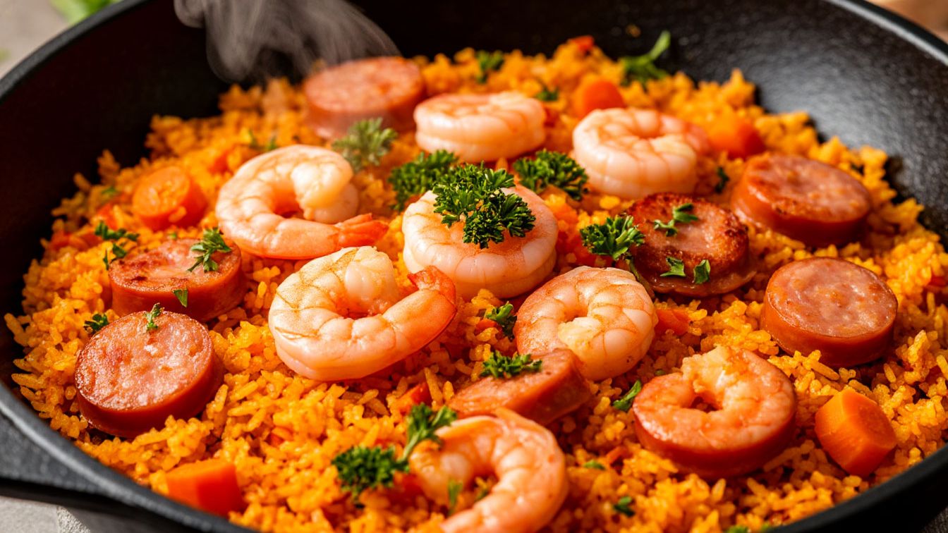 Рецепт, как приготовить рассыпчатый Плов на сковороде с Креветками и Колбасками.