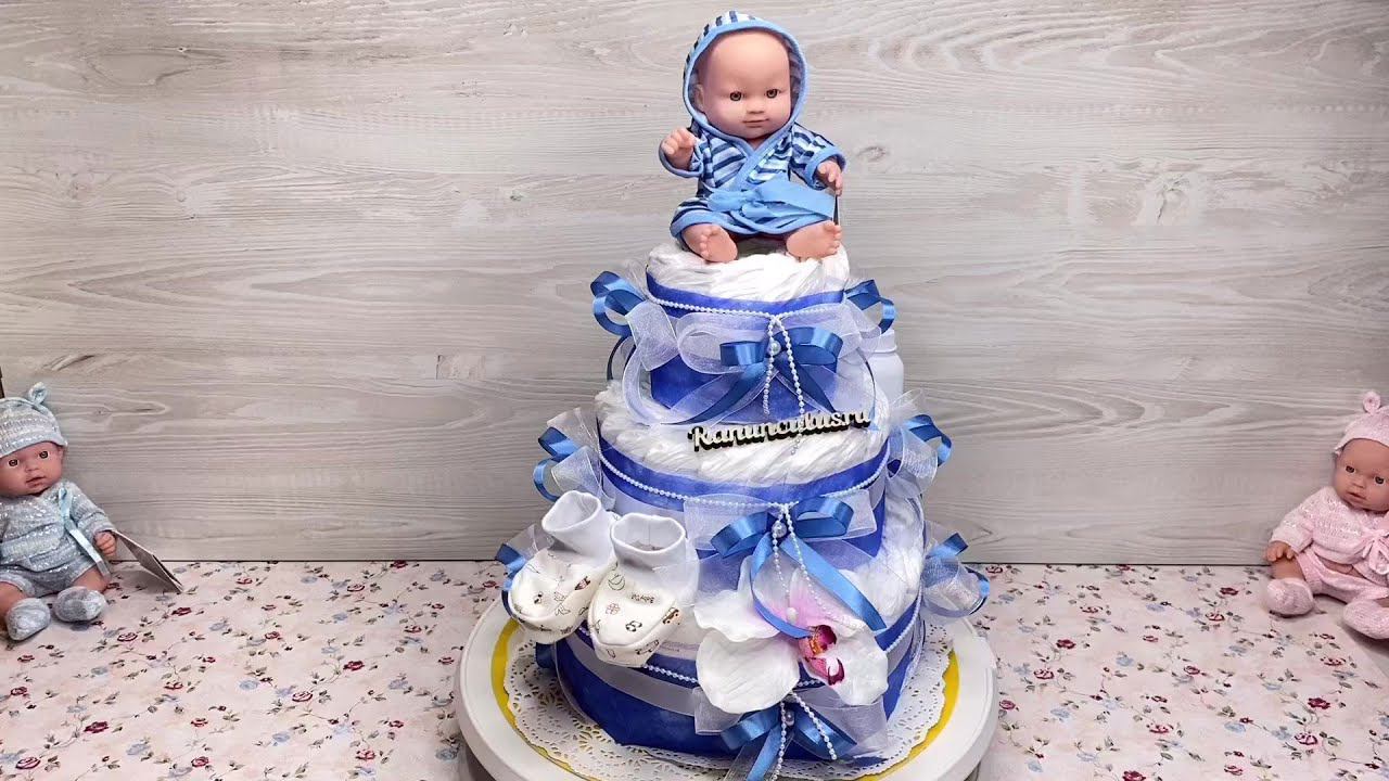 Торт из памперсов для мальчика в синих тонах. Выбрать и купить торт из памперсов можно перейдя по ссылке https://ranunculus.ru/podarki-na-rozhdenie-rebenka/torty-iz-pampersov/ Сайт https://ranunculus.ru