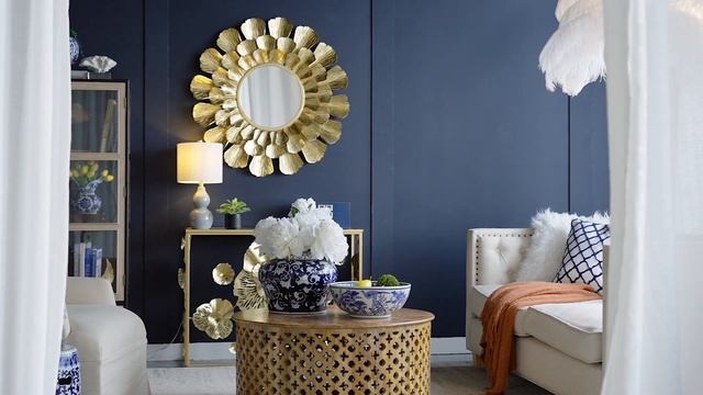 Настенное зеркало в современном стиле, украшенное металлическими акцентами в виде солнечных лучей, подчеркнет красоту вашей гостиной или спальной комнаты.