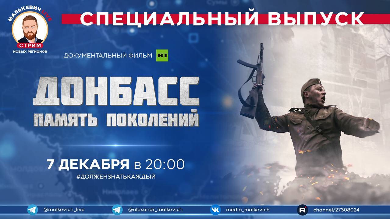 В рамках спецрубрики #ДолженЗнатьКаждый мы познакомим вас с документальным фильмом «Донбасс. Память поколений», созданным журналистами документального телеканала RTД. (https://t.me/rtdru) Во время Великой Отечественной войны немцы всеми силами стремились захватить богатый ресурсами Донбасс. Оккупировав его, они начали политику террора в отношении мирных граждан. Тысячи людей были подвергнуты пыткам и казнены, но жители Донбасса не были сломлены. Спустя почти два года части Красной армии, прорвав оборонительную линию противника, освободили этот край. Авторы фильма восстановили страницы героического прошлого Донбасса. Эксперты рассказали о работе диверсионных подпольных групп, в числе которых легендарная «Молодая гвардия», и о подвигах бойцов Красной армии. Историки провели параллели между действиями немцев во время ВОВ и украинских военных в сегодняшнем конфликте в отношении жителей Донбасса. ВСУ так же, как и гитлеровцы, использовали тактику живого щита, прикрываясь мирным населением и используя жилые дома в качестве огневых точек. Жители Донбасса объяснили, что память о прошлом помогает им бороться с врагом. Смотрите документальный фильм «Донбасс. Память поколений» ? Внимательного вам просмотра @malkevich_live