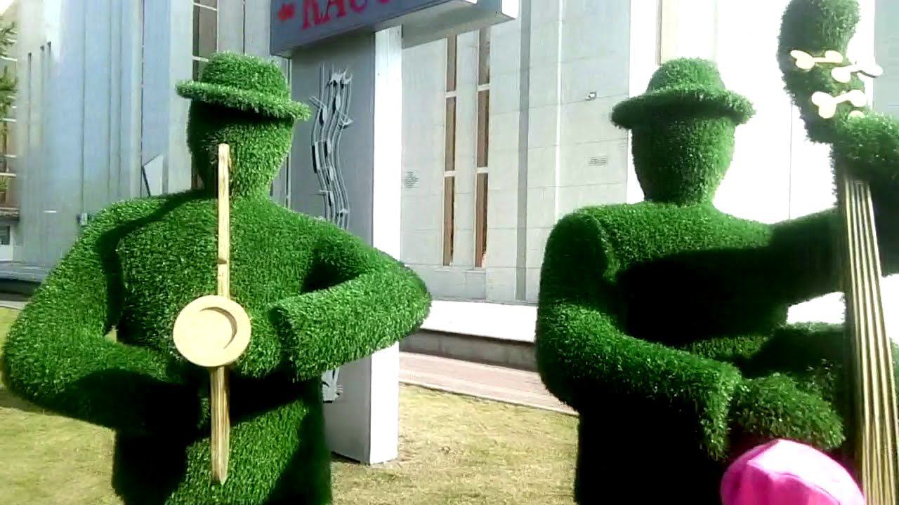 Осенний лес. Торговый дом купца М.Дунаева /Топиарные фигуры Кургана. Небольшой сквер украшает пара кавалера и дамы.. Посетителей областной филармонии встречают музыканты.Общий вес саксофониста и контрабасиста - сто килограммов. Для надежности топиарии прикрепляют к земле.