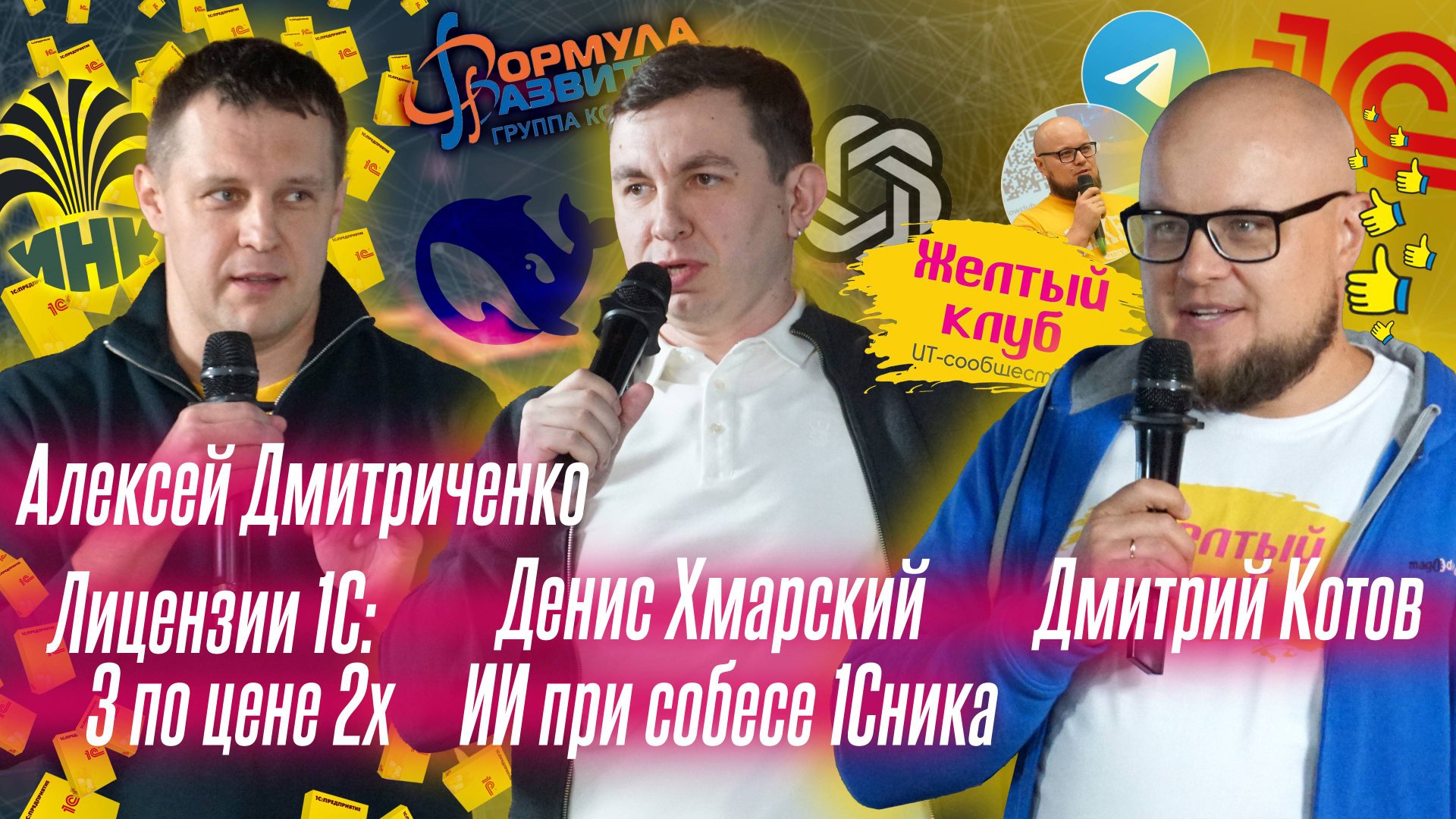 Видеозапись четвертого митапа Желтого Клуба в Иркутске Организовал встречу Дмитрий Котов (https://t.me/top_1c), его телеграм канал "1С Заметки" посвящен всему что связано с работой и жизнью 1Сника, будь он программистом или аналитиком. Мероприятие прошло при поддержке Желтого клуба (https://t.me/yellowclub_official). Видеосъемка и монтаж выполнены Владимиром Альбовым (https://albov.ru). Фотограф Дмитрий Калугин (https://t.me/dv_kalugin). Спикеры: Алексей Дмитриченко — «Лицензии 1С: 3 по цене 2-х». Денис Хмарский — «Разбор собеседования 1Сника с помощью ИИ». Таймкоды: 00:00 — Вступительное слово Дмитрия Котова. 03:34 — Доклад Алексея Дмитриченко. 28:56 — Ответы на вопросы (Алексей терпеливо отвечал, пока мы ждали пиццу. Спасибо ему за это!). 50:00 — Перерыв на пиццу и нетворкинг. 51:15 — Доклад Дениса Хмарского. 01:14:15 — Ответы на вопросы. 01:34:06 — Завершение мероприятия. Подписывайтесь на канал, ставьте лайки и включайте уведомления — это вдохновляет нас продолжать и развиваться!