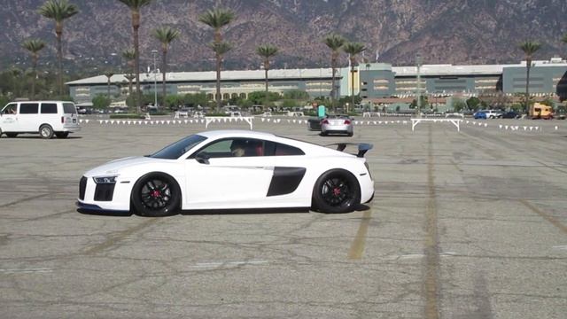 A white Audi R8 V10 Plus with Larini exhaust system and Vorsteiner VRS aero kit and wheels leaving Morning Octane / PML Quickstrike at Santa Anita Park. (December 9, 2017 / Arcadia, CA) Also caught on this video: Acura NSX