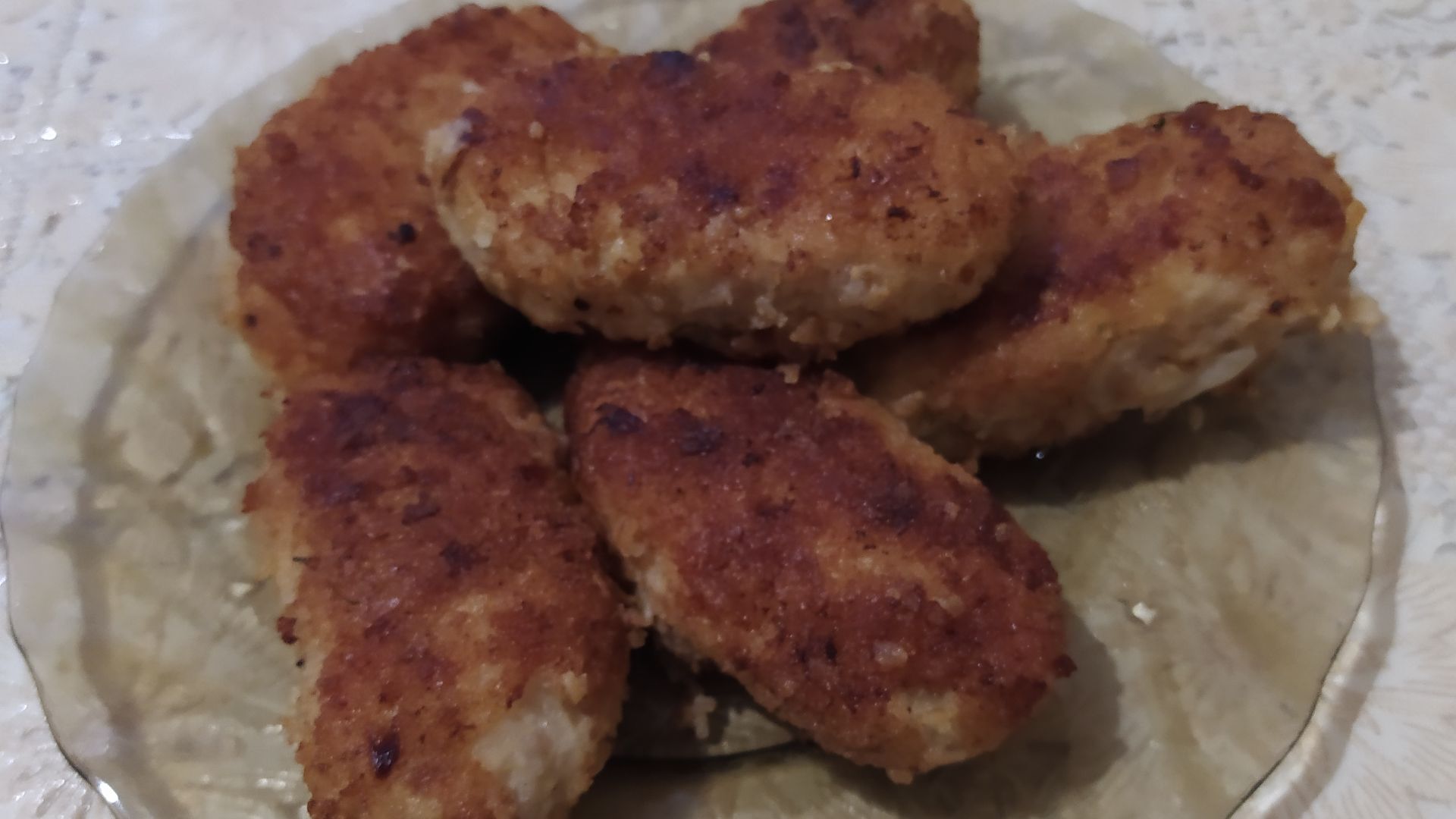 Секрет пышных и нежных котлет - надо долго взбивать фарш с желтком до пышности. Для котлет нужно 300 грамм фарша , 1 луковица, 1 яйцо, панировочные сухари, соль и черный молотый перец ( по вкусу).