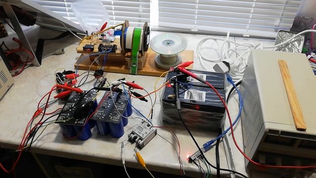 Малый генератор Бедини от источника питания 12В для зарядки небольших аккумуляторов на 12В. Работает только при достаточной нагрузке, в качестве которой выбраны два блока ионисторов. Генератор начинает работать, когда напряжение на блоке ионисторов невелико (достаточная нагрузка) и перестаёт работать, когда напряжение возрастает (малая нагрузка). Чтобы обеспечить постоянную работу, используются два блока ионисторов, соединённых последовательно, - когда один заряжается, другой разряжается, и потом идёт переключение генератора с одного ионистора на другой (в ручном режиме). Между ионисторами и аккумуляторами вставлено на плюсе твердотельное реле, которое замыкает контакт, когда суммарное напряжение на ионисторах достигает величины 13.37В, и идёт разрядка на аккумуляторы, соединённые параллельно. Реле срабатывает от микроконтроллера Ардуино через датчик напряжения, подключенный к двум батареям ионисторов. Генератор работает от источника лабораторного питания 12В. Ардуино - от выпрямителя 5В, который питается от сети.