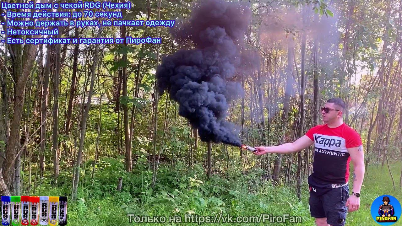 https://vk.com/PiroFan - официальный магазин Цветной дым с чекой RDG (Чехия) - Время действия: до 70 секунд - Цвета в наличии: оранжевый, красный, синий, зелёный, чёрный, жёлтый, белый - Можно держать в руках, не пачкает одежду - Активация: РЕЗКО выдернуть чеку ВБОК - Есть сертификат и гарантия от ПироФан