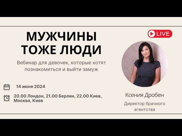 Мы встречаемся с вами в пятницу, 14 июня - и тема у нас будет "Мужчины тоже люди". Данный вебинар даст вам понимание, как правильно общаться с мужчинами, что отстоять свои границы и выстроить здоровые отношения Так что на пятницу вечером ничего не планируйте - будем обсуждать мужчин и человечность))) Вебинар состоится в пятницу, 14 июня Время: 20.00 по Лондону, 21.00 по Берлину, 22.00 по Киеву, Минску и Москве Вебинар пройдет на платформах: на канале YouTube Ksenia Droben https://www.youtube.com/@KseniaDrobenPartnervermittlung На странице Facebook https://www.facebook.com/ksenia.droben В группе Facebook https://www.facebook.com/groups/datingmarriageagency VK https://vk.com/kseniadroben Instagram @kseniadroben Tiktok: @kseniadrobendating В субботу у нас онлайн вечеринка - до сих пор заявок мало. И меня это очень огорчает. Знакомиться-то будем? https://bridespb.com/ru/vstrecha-znakomstv-online/ В следующую субботу -22 июня - вечеринка знакомств в Мюнхене. Если вы знаете кого-то, кому эта информация может быть полезной, пожалуйста, порекомендуйте С уважением Дробен Ксения Директор международного брачного агентства www.droben-partnervermttlung.de Whatsapp +49 1520 366 3653