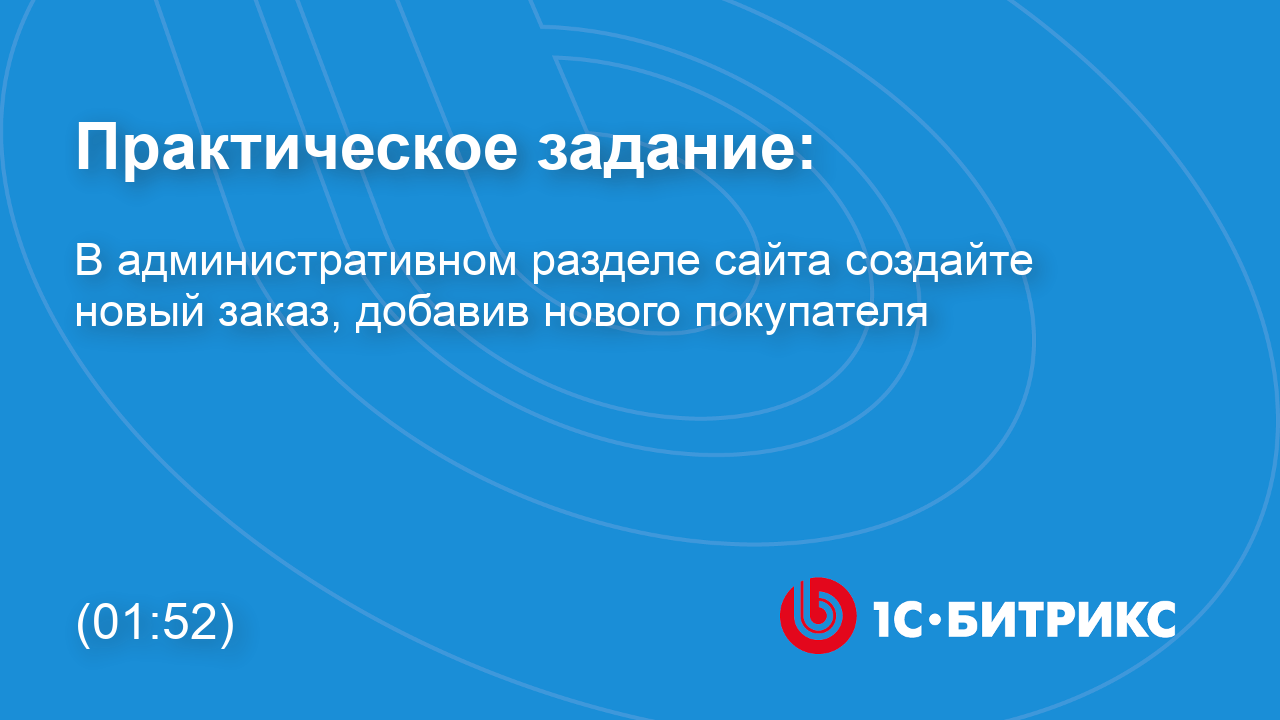 К уроку Практические задания в главе "Заказы": https://dev.1c-bitrix.ru/learning/course/index.php?COURSE_ID=42&LESSON_ID=25136 ** видео без голосового сопровождения Задание № 1: Создайте в административном разделе сайта новый заказ, добавив нового покупателя.